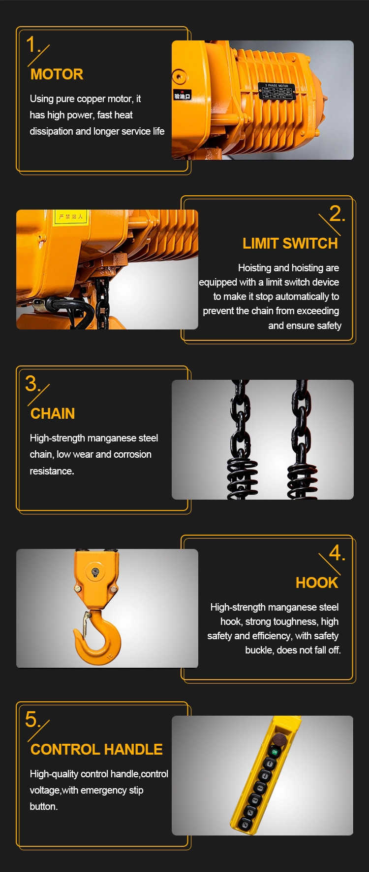 チェーンホイストは、産業企業、鉱山、農業、鉄道、海港、倉庫、通常工場、ワークショップなどで広く使用されています。製品は、国の基準に準拠しています。私たちが使用した材料はすべて良質です。それは最近の作業効率および労働条件を改善するための理想的な装置である。